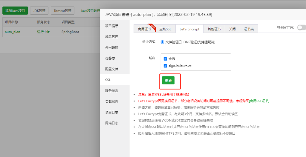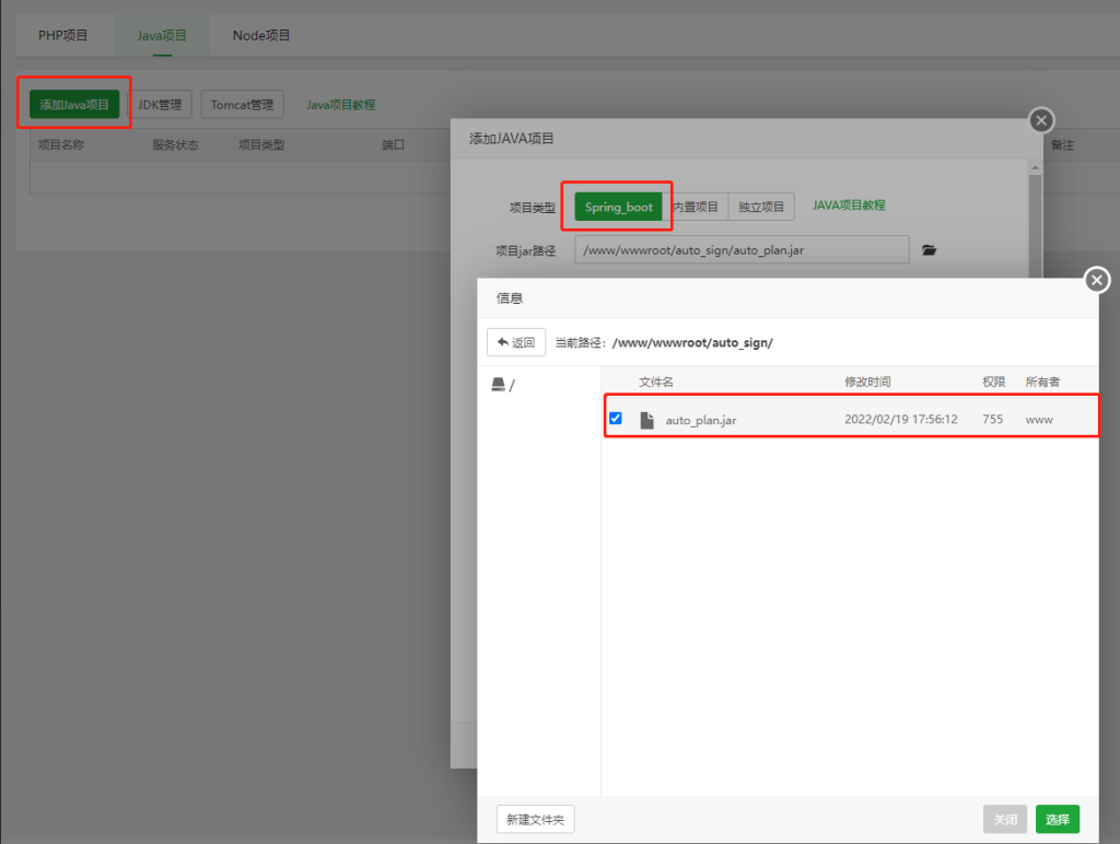 我们点击添加Java项目、选择Spring_boot,项目jar路径填写我们上传好的auto_plan.jar