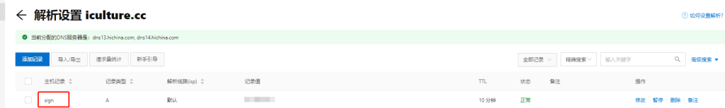 我们需要事先做好域名解析,选择记录类型为A,这里我们设置的主机记录是sign,记录值填我们的服务器IP地址