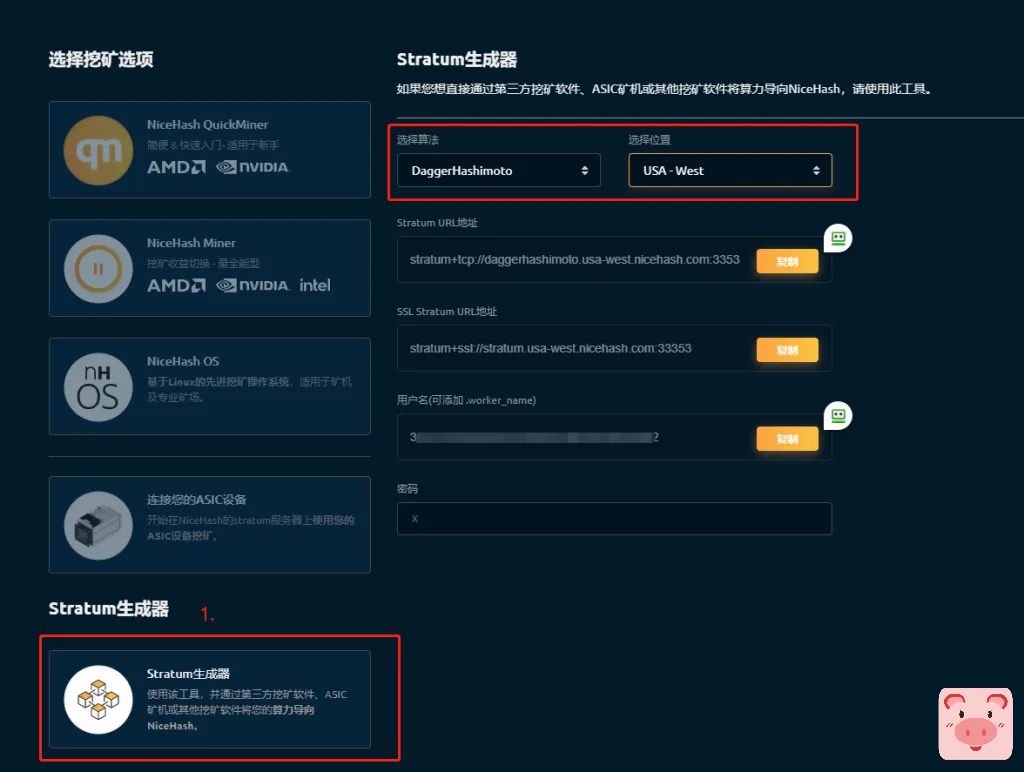 然后选择Stratum生成器,右侧的算法选择DaggerHashimoto,位置任意