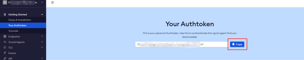 您需要在ngrok上注册一个账户,然后登录到后台,就可以看到authtoken了,点击copy就可以复制了
