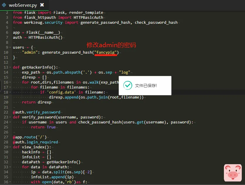 然后修改webServer.py中admin的密码,当然,你也可以更换用户名,这个根据个人习惯来修改。