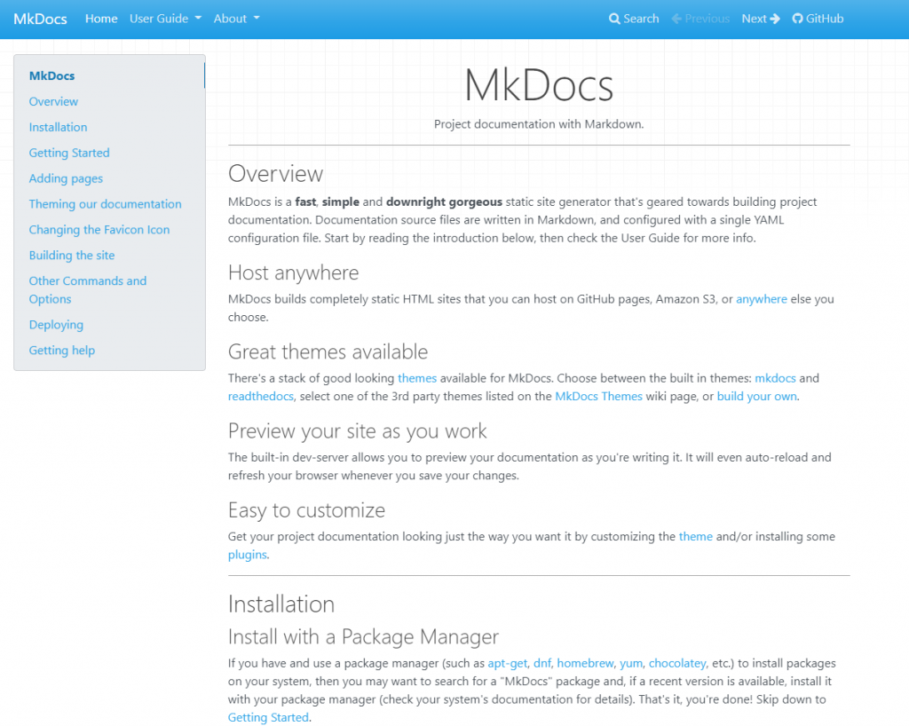 MkDocs,免费开源的wiki项目,页面看上去还是蛮不错的,而且支持自定义主题的二次开发
