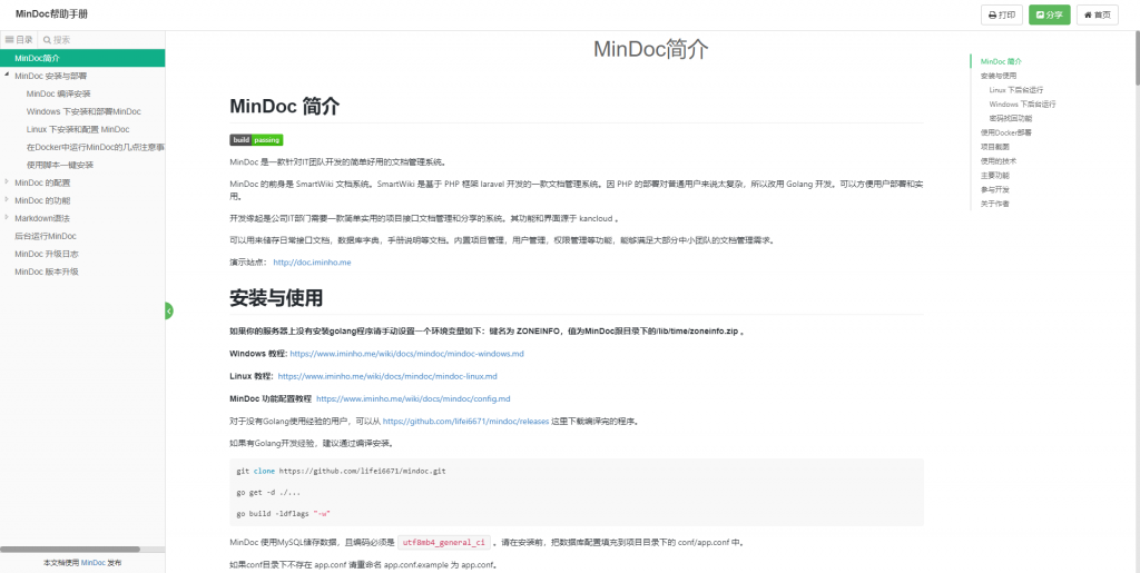 看了半天,最后我还是选择了MinDoc,主要是MinDoc开源程序可以支持不同用户、用户权限发布内容,发布不同产品项目,比较适合公司企业的使用场景,再加上是用Go语言开发的,就别提有多舒服了(你用过Go的项目,感觉有慢的吗?)。