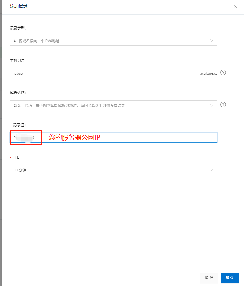 我们需要事先做好域名解析,选择记录类型为A,这里我们设置的主机记录是jubao,记录值填我们的服务器IP地址