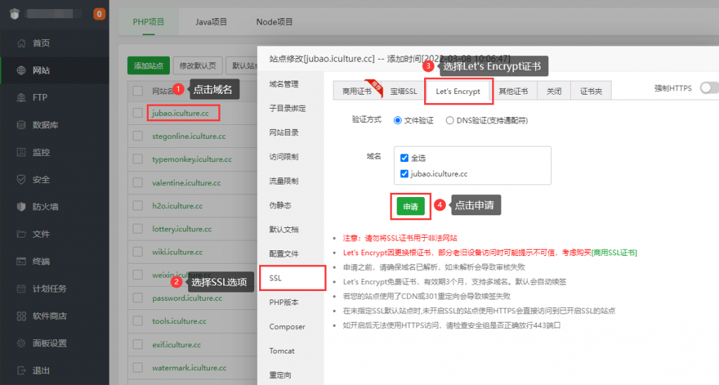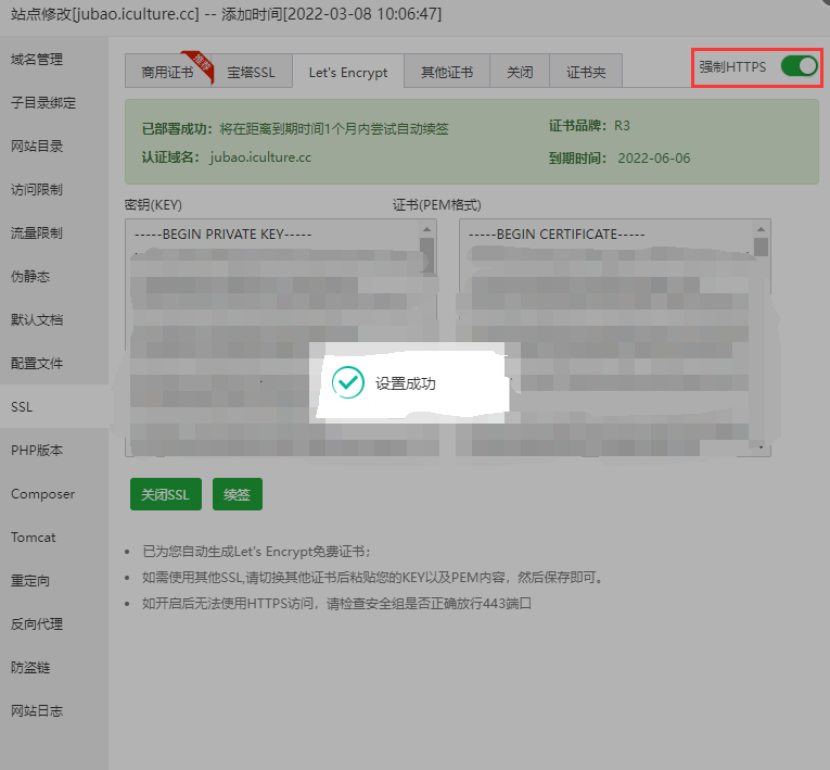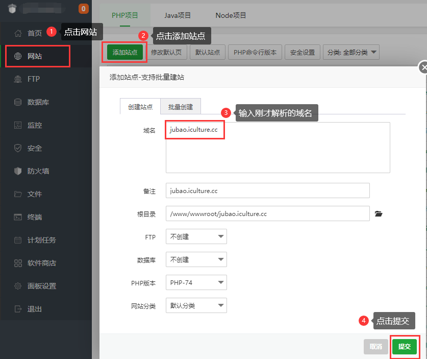 我们先在宝塔后台网站中添加站点,输入我们刚刚解析好的jubao.pigsec.cn