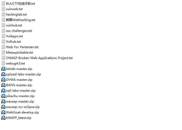 包含BUUCTF在线测评、vulnweb、hackinglab、webhacking、vulnhub、xss chanlleges、vulApps、Web For Pentester、Metasploitable、Owasp Broken Web Applications Project、webug4.0、btslab、upload-labs、DVWA、BWVS、sqli-labs、pikachu、wavsep、WebGoat、bWAPP等多个靶场