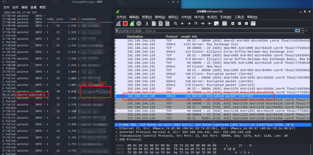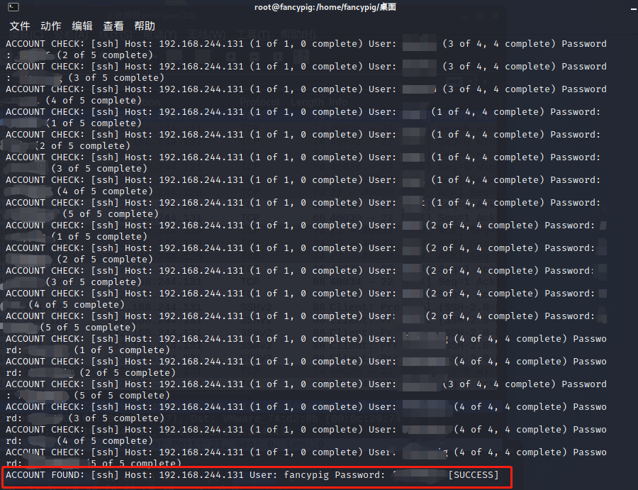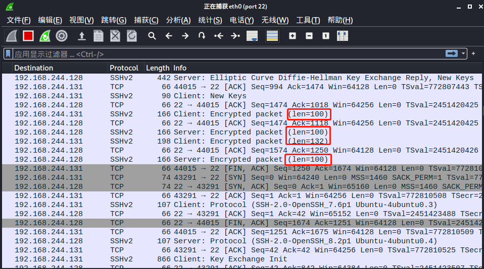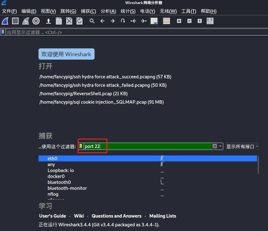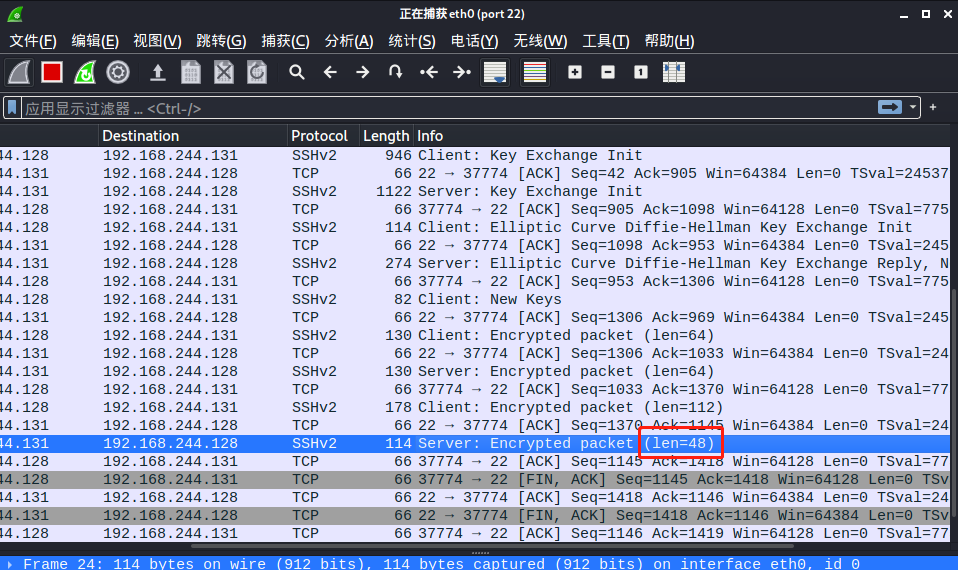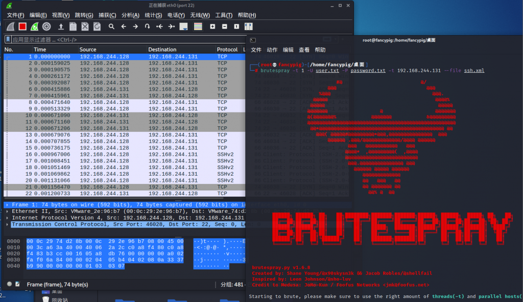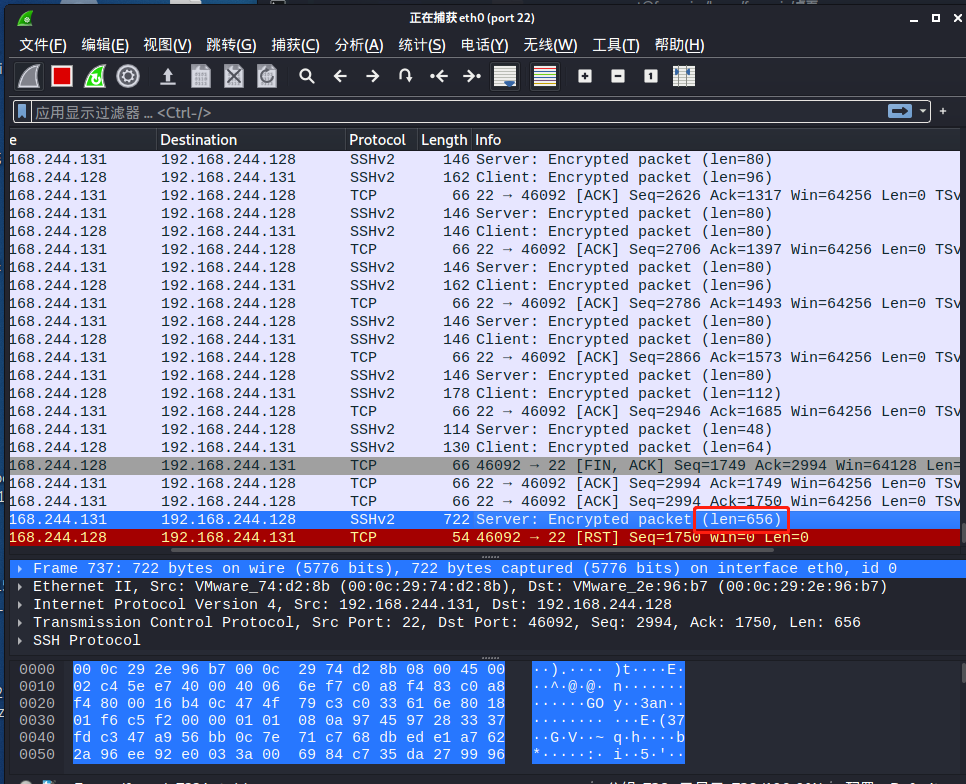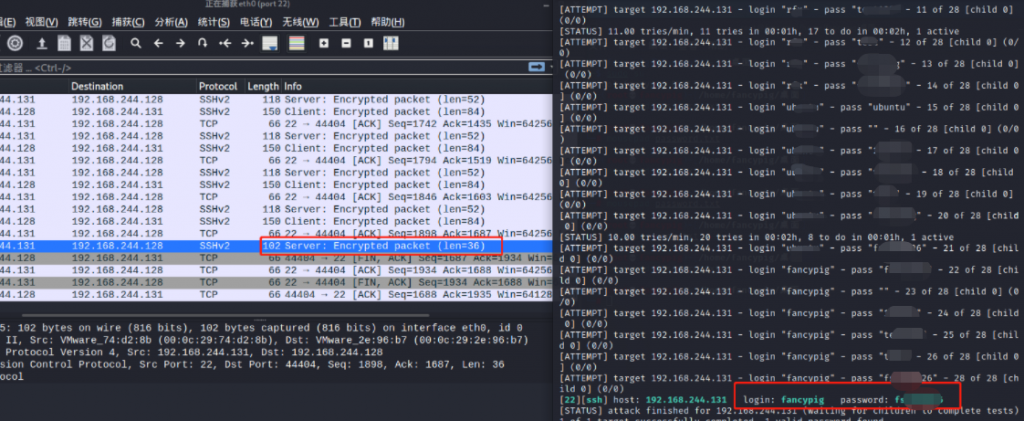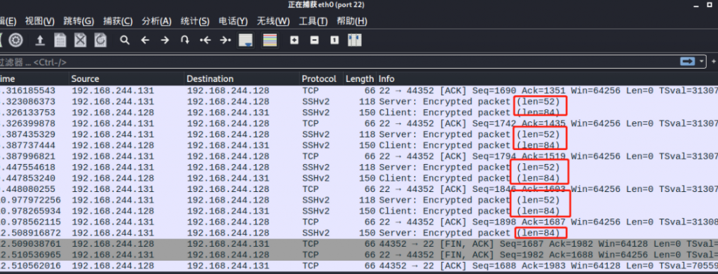 我们这里设计的时候,故意将真实的账户和密码都放到这两个文件的最后,然后我们用hydra的单线程进行暴力破解,并打开kali linux虚拟机中的wireshark,这里我们过滤器里设置port 22只抓22端口的包