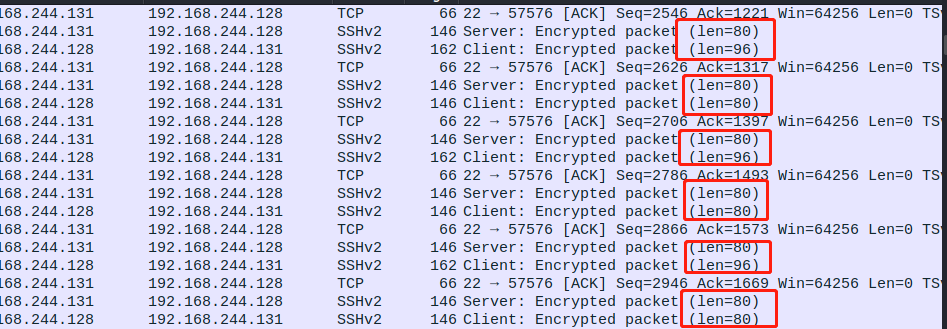 几乎所有尝试密码错误的加密包长度(len)都是相同的,发送包长度(len)为84,返回包长度(len)为52