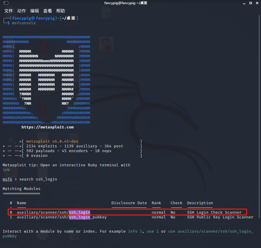 输入msfconsole打开框架,然后搜索ssh暴力破解的模块