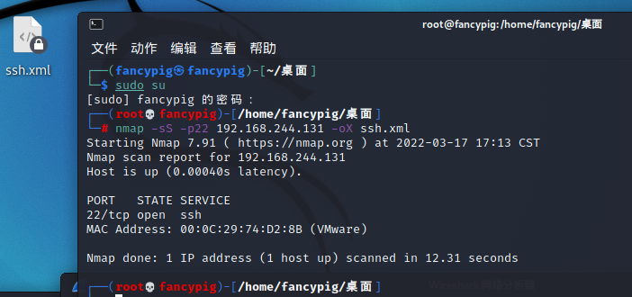 sudo nmap -sS -p22 192.168.244.131 -oX ssh.xml