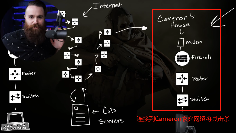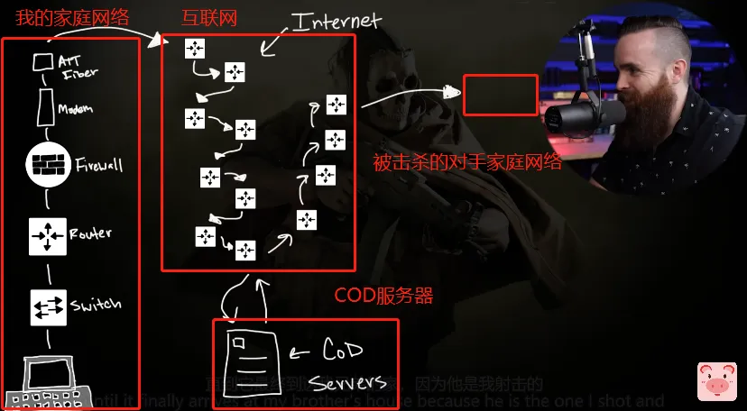 那么,上面的图片只是展示了家庭网络连接互联网的一个模型,那么我们射击到对手被击杀的完整的模型应该是怎样的呢?可以参考下面的图片,我们的家庭网络连接到互联网之后,又经过路由器跳来跳去,最终到达《使命召唤》游戏的服务器,最终《使命召唤》服务器在通过互联网上的路由器跳来跳去,最终返回对手的家庭网络