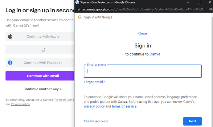 很多时候,当我们通过 Google、Microsoft、Apple 等对网站进行身份验证时,我们会看到一个弹出窗口,要求我们进行身份验证。下图显示了当有人尝试使用其 Google 帐户登录 Canva 时出现的窗口。