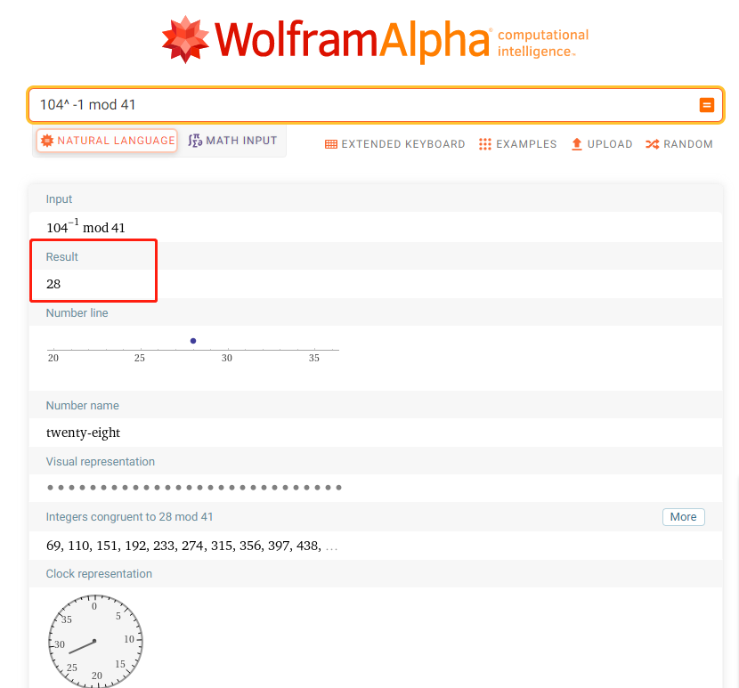 它的模逆元素是28,我们可以进行验证
