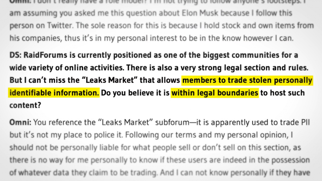 现在,您可能会认为促成此类数据泄露的网站所有者会理解他们的做法是错误的,但他们不会在意,因为“钱”。但在接受“therecord”采访时,raidforums 的所有者给人一种滑稽的妄想。所以,面试官问全能——哦,顺便说一句,网站的所有者称自己是全能的,就像——告诉我你有一个上帝情结而不告诉我你有一个上帝情结。但我们只是称他为 Omni,因为好吧 - 它的音节更少。采访者询问 Omni,“允许 [ing]成员交易被盗的个人身份信息”是否“在法律范围内”。