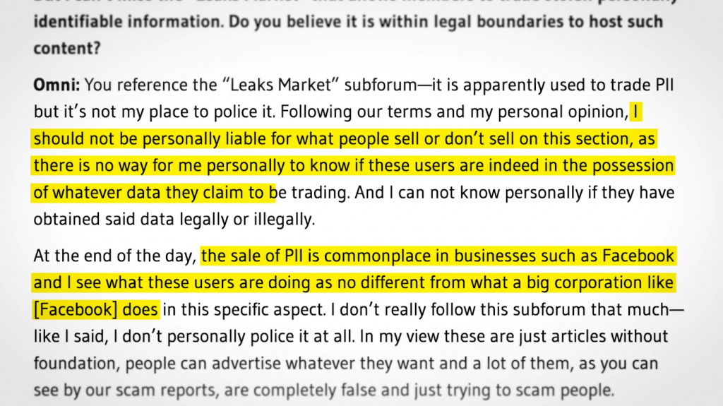 用 Omni 的话来说,“PII 的销售在 Facebook 等企业中司空见惯,我认为这些用户的行为与 [Facebook] 等大公司的行为没有什么不同”。“我不应对人们在此部分出售或不出售的内容承担个人责任,因为我个人无法知道这些用户是否确实拥有他们声称正在交易的任何数据。”