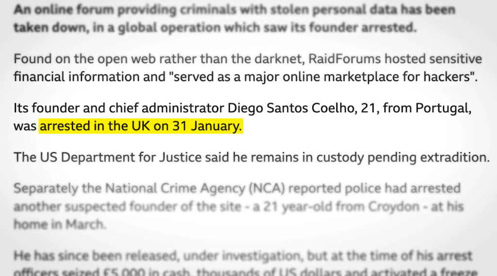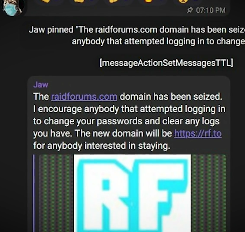 RaidForum 的一位管理员在官方Telegram 频道上发帖称“raidforums 域名已被占用”,但他没有说明被谁占用。当时,有些人认为俄罗斯当局已经抓住了它,因为由于乌克兰战争,raidforums 曾发誓要禁止所有用户从俄罗斯连接。