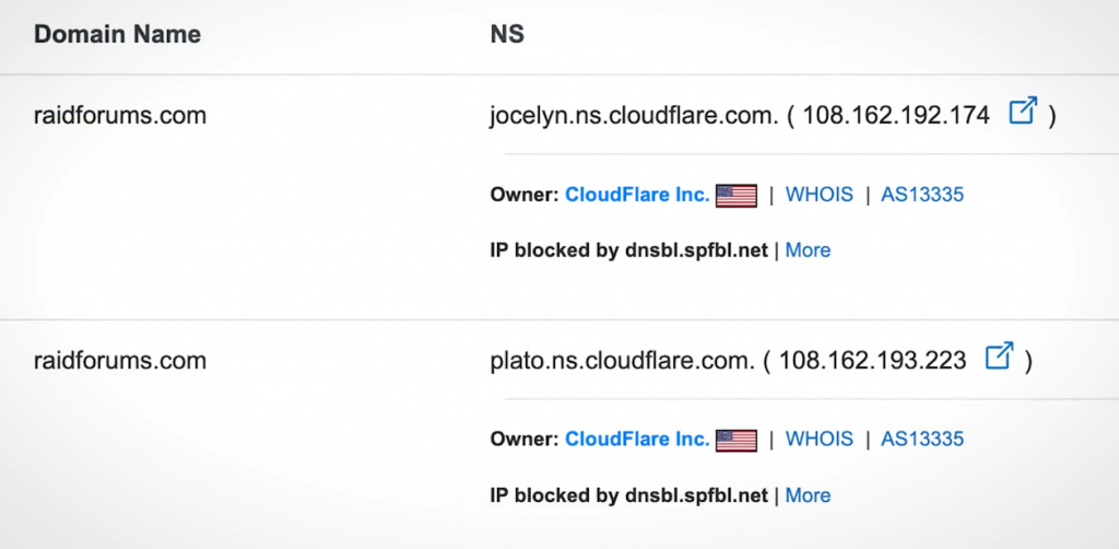 但是,安全研究人员得到了一个相当重要的线索,即域名的名称服务器已被更改。占领该域名的人已将其更改为“jocelyn.ns.cloudflare.com”和“plato.ns.cloudflare.com”。事实证明,这些是已知被美国执法部门用来托管被扣押域名的域名服务器。