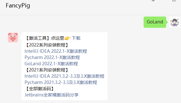 除了在上面的按钮获取,我们的FancyPig微信公众号中设置了关键词回复,输入GoLand获取