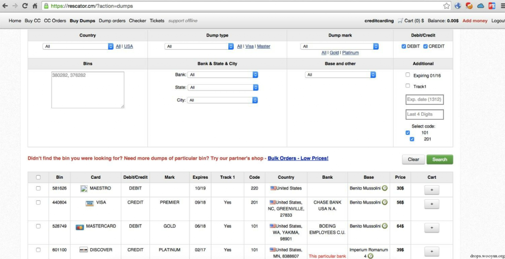上述三个最近的新闻中都是用户在看似正常的消费或取款后,但自己的卡却被盗刷了,在国内这种现象很常见。而在银行卡欺诈中,国外的已经形成了比较成熟的黑色产业链,借助匿名网络、暗网、比特币等变得愈发猖獗。如下是国外的一个银行卡信息交易网站,用户可根据卡的类型等选择购买,购买后再通过线下制卡或线上使用等各种渠道去套现。