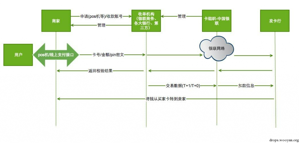 - 交易说明:商户在向这里是向建设银行,提交pos机申请。申请成功后建设银行负责安装pos机并调通。 刷卡结算时候,首先操作员在pos机设置消费金额,然后在pos机刷卡,并输入pin密码,pos机将卡号、金额、pin密文等通过加密方式发送到收单机构(建设银行),收单机构将信息通过卡组织的银联网络将信息转发到发卡行(招商银行),招商银行校验卡类型以及金额、pin等信息,确认无误将校验结果通过银联网络发送给商家,支付成功。支付成功后此时发卡行会把用户的卡金额冻结,等待卡组织进行资金清算。而此时买家的钱还未打到商家的账号,收单机构会与商户签订结算周期,比如T+1(第二天钱到账)、T+0(当天到账)的方式,收单机构通过汇总商户的收单信息通过银联网络发送给不同的发卡行请求扣款,各发卡行确认无误后将钱通过银联网络转到商户的对公账号里。至此交易完成。