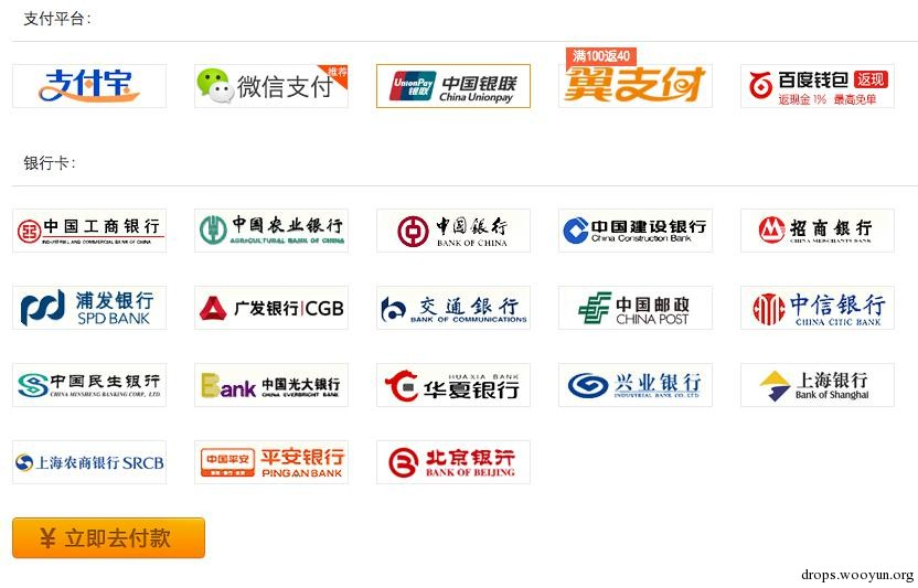 中国银联支付平台提供各大银行的综合在线支付收单系统、同时各大银行也会提供自己的收单接口。