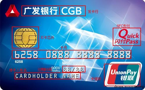 卡正面主要有发卡行、卡组织、卡号、持卡人姓名、卡过期时间等信息。