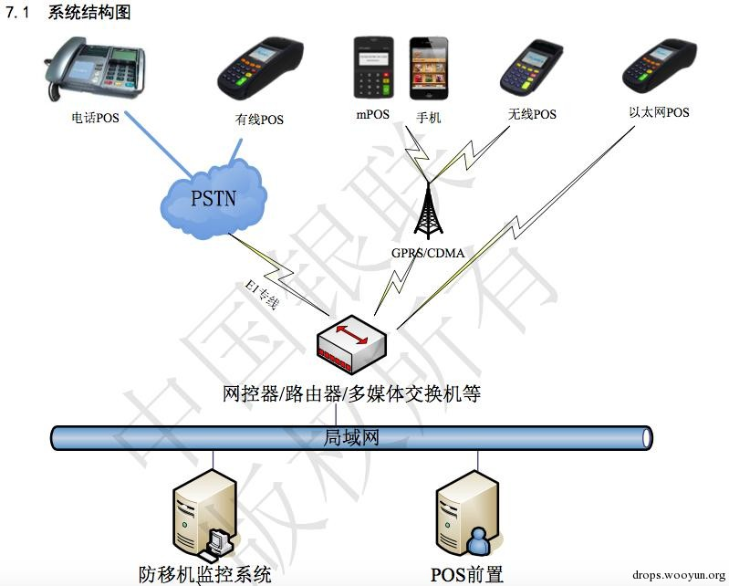 可以看到,支付设备可以通过PSTN网络、GPRS/CDMA网络、以太网进行通信,所有的通信数据最终流向了POS前置,POS前置部署在内网,用于对所有的收单行发送的支付订单信息进行处理。