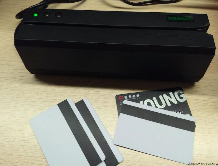 我们使用如下的MSR 605设备来读取卡数据,其中白色的卡为空白卡,支持多次擦写数据。
