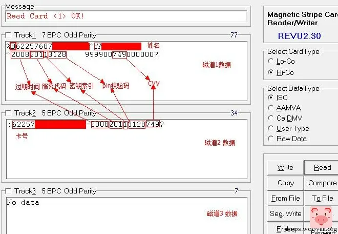 该普通磁条卡只在磁道2存储了卡数据,存储了卡号、CVV、过期时间等值。