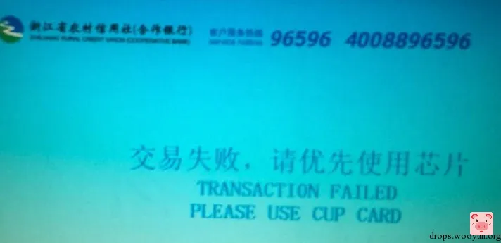 注意,芯片卡的磁条里存储了卡信息,其芯片里也存储着用于交易的磁道信息。若读取芯片卡上磁条的数据,然后将数据写入一张空白的卡里,去取款机里使用,会提示使用芯片功能,如图。