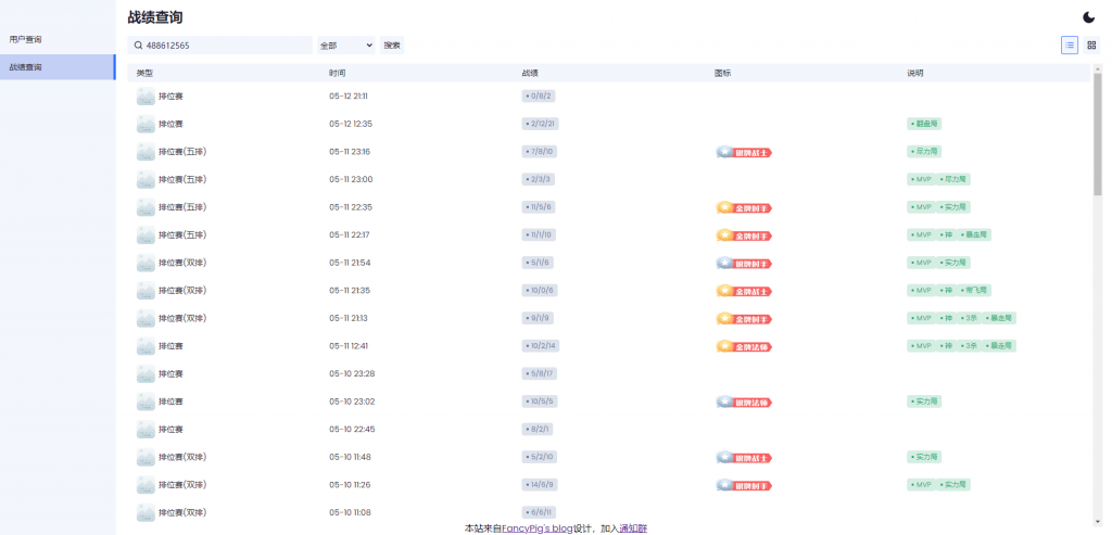 通过抓包分析得到的相应接口做成工具,我们可以快速输入营地ID获取战绩、对局信息