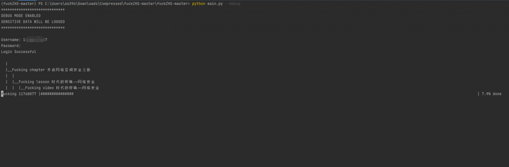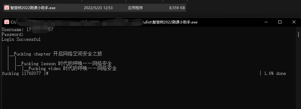 然后输入username即手机号,password即密码,然后就可以开始刷课了,和打包版完全一致,这里不再演示