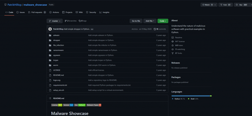 在Github上有个专门的仓库,里面都是Python编写的一些恶意软件,包括但不限于恶意广告、dropper、恶意文件感染、勒索软件、特洛伊木马、蠕虫病毒