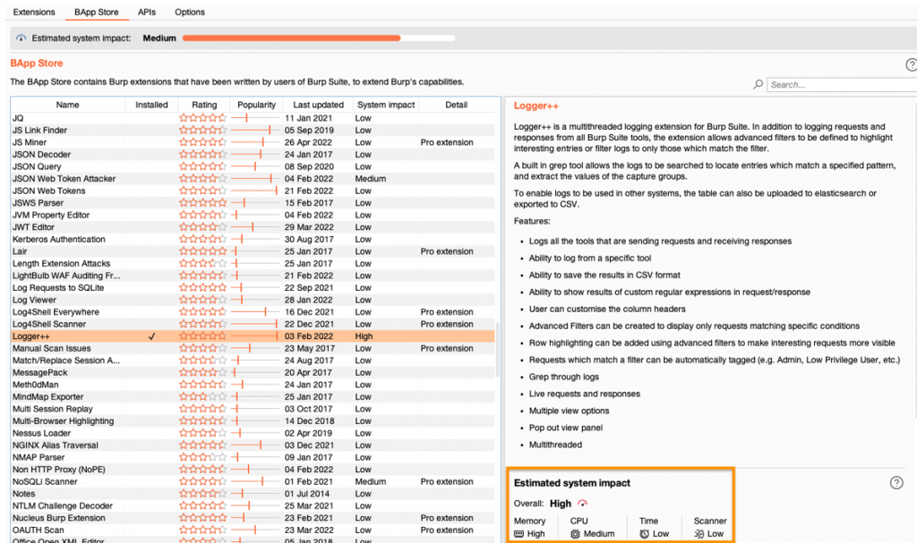 在Extender > BApp store选项卡上,我们现在显示我们估计每个 BApp 在您的系统上放置多少负载的指示。