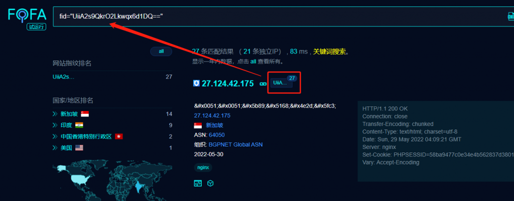 我们可以通过Fofa搜索站点域名,然后可以找到对应的指纹