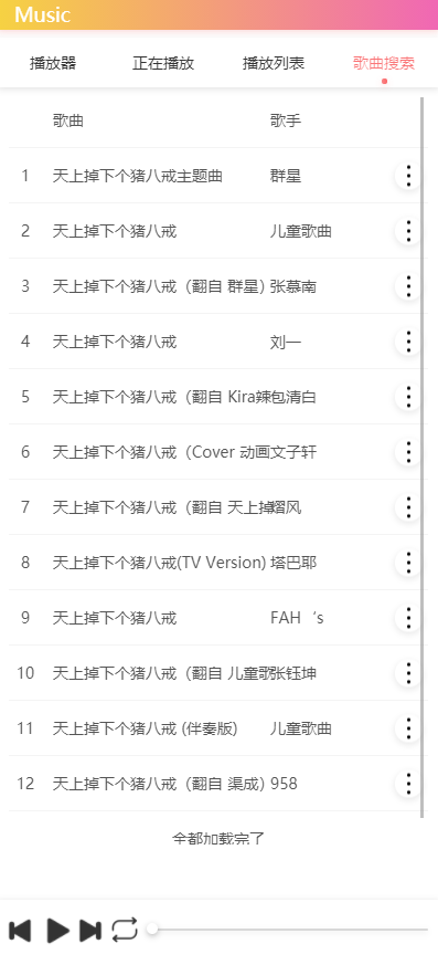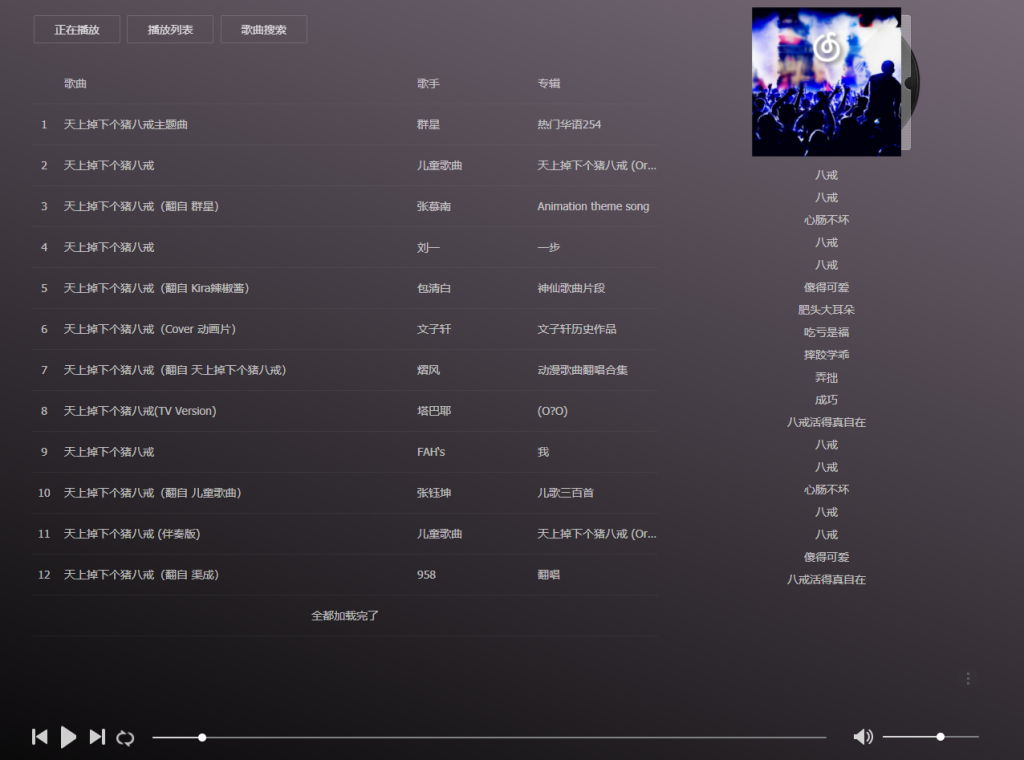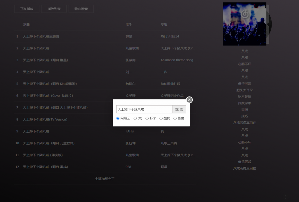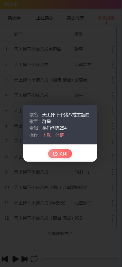 简洁美观的在线音乐播放器 附源码和配置教程作者:FancyPig | 发布时间:2021-08-20 23:24:46 | 更新时间:2021-08-20 23:30:13 功能介绍 大小仅1.23MB的精简在线音乐播放器,支持以下播放音乐来源 网易云音乐QQ音乐虾米音乐酷狗音乐 同时支持外部链接和下载等诸多功能 在线体验 点击下方按钮进行体验 猪头在线音乐 界面截图 PC版 手机版 源码部署教程 此处内容已隐藏,请评论后刷新页面查看. 标签:QQ音乐, 网易云, 音乐播放器, 在线播放, music, 在线音乐, 腾讯音乐, 虾米音乐, 酷狗音乐