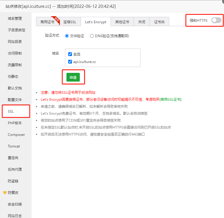 创建完成后养成好习惯,开启SSL并强制SSL
