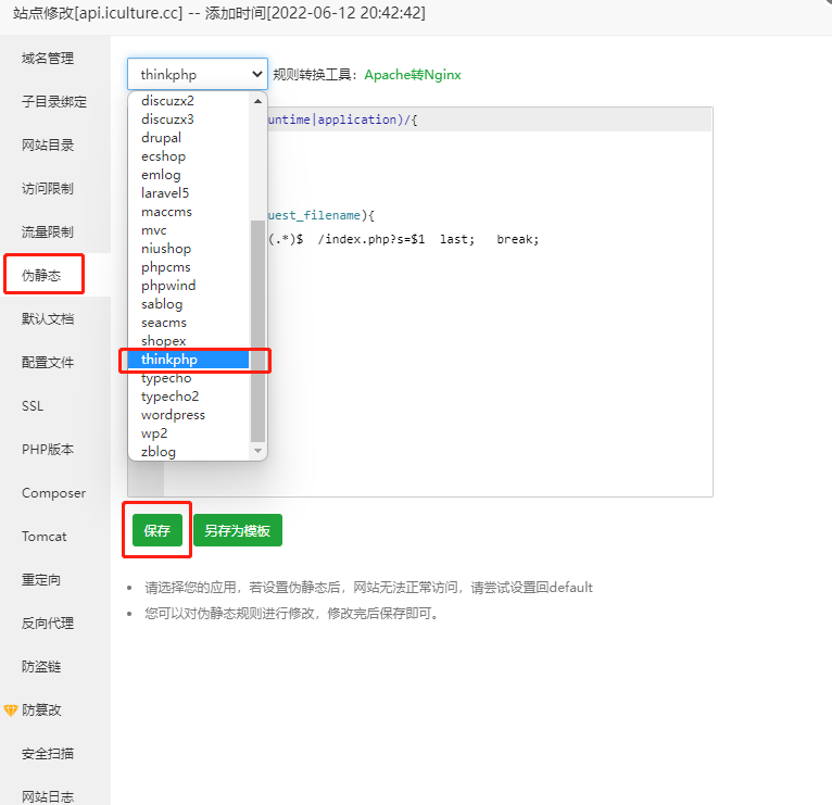 设置伪静态,选择thinkphp并保存