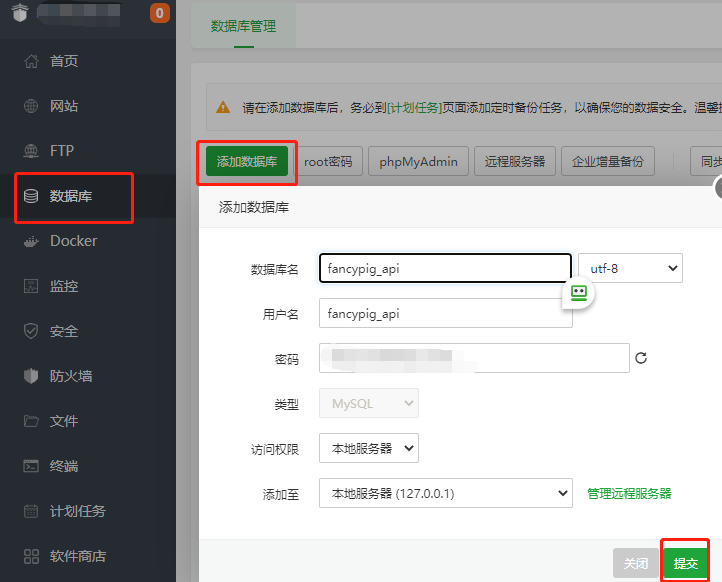 我们需要添加一个数据库,可以根据个人习惯进行命名,密码随机生成即可