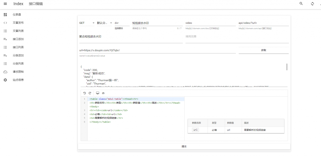 后台添加接口,因为我们刚才新建的目录为video,因此这里接口地址填api/video/?url=