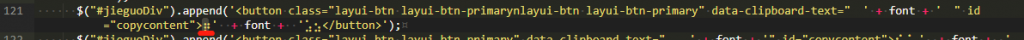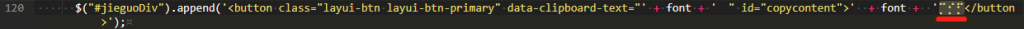 $("#jieguoDiv").append('<button class="layui-btn layui-btn-primarynlayui-btn layui-btn-primary" data-clipboard-text="' + font + '" id="copycontent">⡶' + font + '⣡⣢</button>');