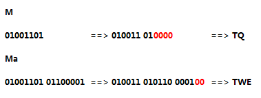 以例子开头的“Man”被转换为“TWFu”为例,我们来看看Base64基本的转换过程: 1. M、a和n的ASCII编码分别为01001101、01100001和01101110,合并后得到一个24位的二进制串0100110101100001011011102. 按每6位一组将其分为4组:010011、010110、000101、1011103. 最后按对应关系从字符集中取出4个字符(即T、W、F、u)作为结果(本文后面列出了由MIME定义的字符集)。 Base64的基本思想就是这么简单:它将每3个字节(24位)转换为4个字符。因为6位二进制数可以表示64个不同的数,因此只要确定了字符集(含64个字符),并为其中的每个字符确定一个唯一的编码,就可以通过正向与反向映射将二进制字节转换为Base64编码或反之。