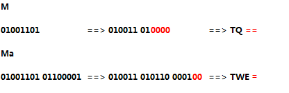 1没什么好说的。后面的2和3该如何处理呢? 遇到这种情况,就需要在剩下的字节后面补零,直到其位数能够被6整除(因为Base64是对每6位进行编码的)。假如还剩下1个字节,即8位,那么需要再补4个0使其成为12位,这样就可以分为2组了;如果剩下2个字节,即16位,那么只需要再补2个0(18位)就可以分成3组了。最后再用普通方法做映射即可。