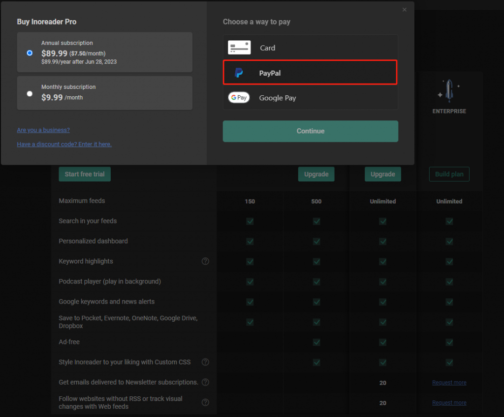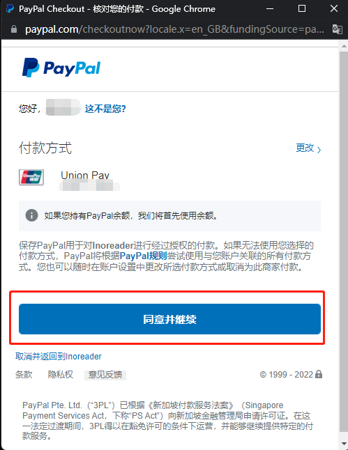 里面的inoreader平台就需要海外支付,我们这里选择PayPal进行支付