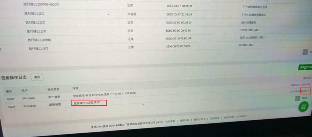 这时,我们让热心网友A去宝塔面板看下操作日志,这里会发现面板操作日志被清空了!热心网友表示不是自己清空的,因此我们可以推测应该是入侵者进行清空的,清空时间是6月30日22点55左右