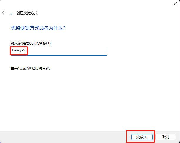 最后我们需要输入这个桌面快捷方式的名称,我们这里以FancyPig命名