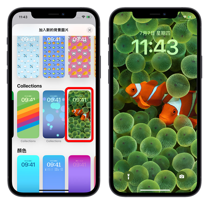 在iOS 16 Beta 3 版本中,苹果为了庆祝iPhone 问世15 周年,在选择背景的Collections 选项中,加入了一组小丑鱼的背景图片。