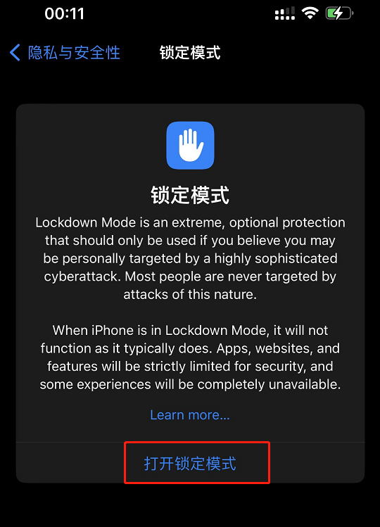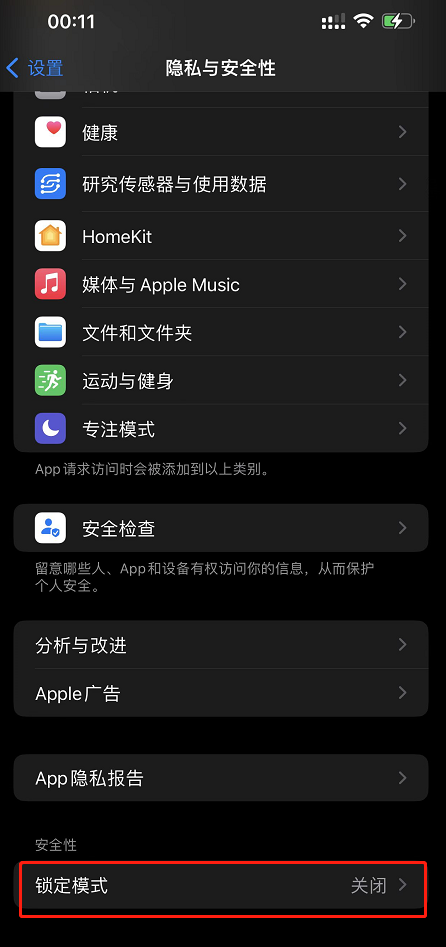 - Lockdown 模式开启后将无法安装配置文件,且设备无法加入移动设备管理(MDM)。