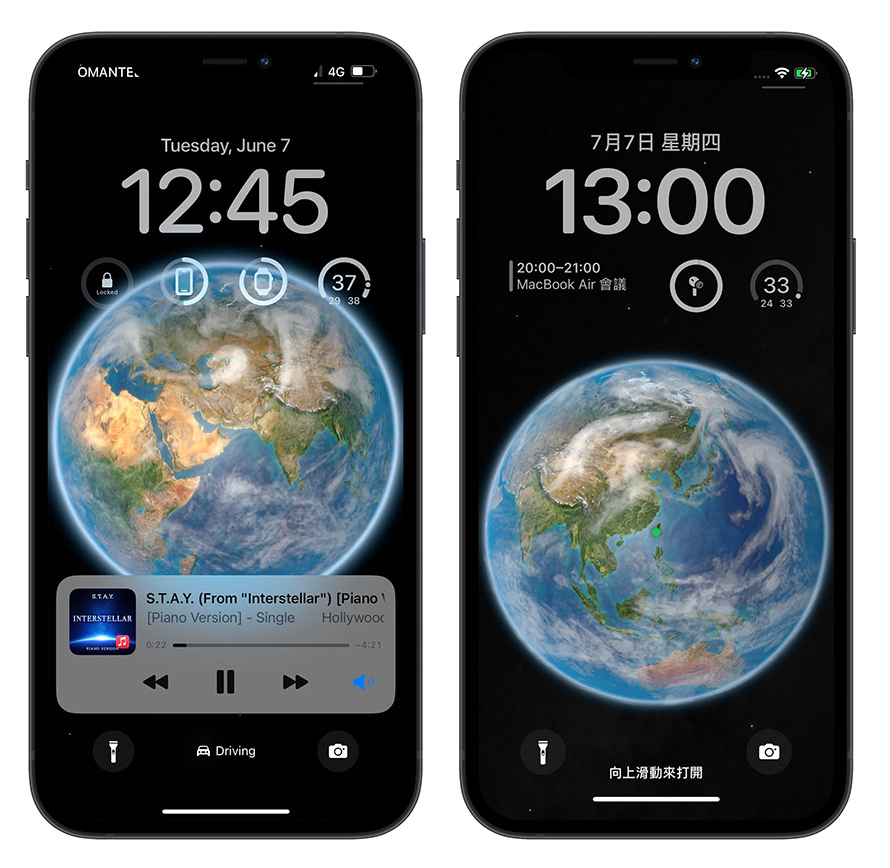 在iOS 16 Beta 3 中,锁定画面如果有使用Widget 小工具的情况下,地球的锁定画面样式会被往下移一点,因为原本的位置会被Widget 小工具挡到。
